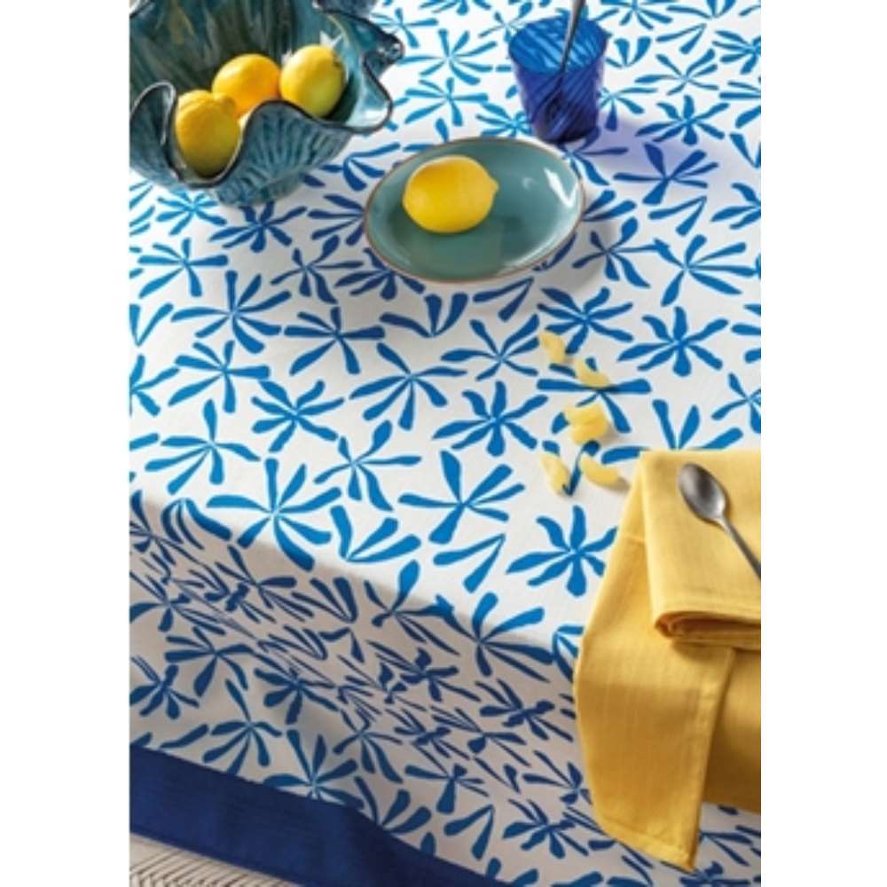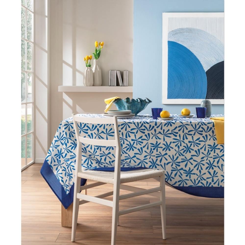 Tablecloths in stain-resistant and waterproof yarn: soft, nice to the touch, 100% made in Italy, to furnish interiors with style and functionality. With exclusive decorations, they are available for 4, 6, 8, 10 or 12 places or as 2-place runners and they can be combined with napkins of plain linen and cotton. Stain-resistant waterproof polyester, 1 cm hem.