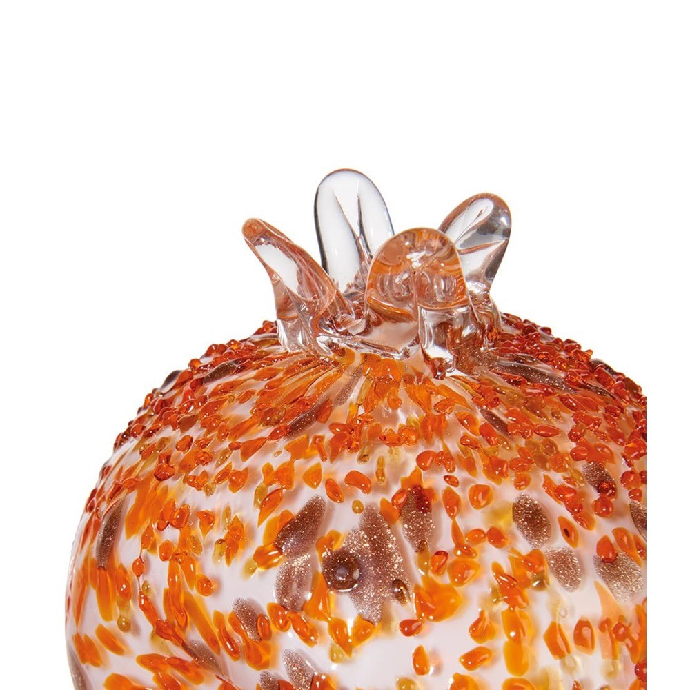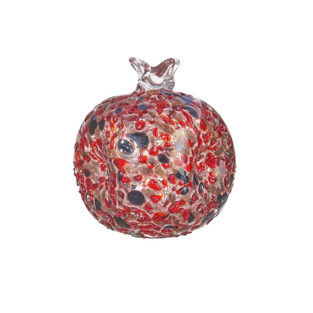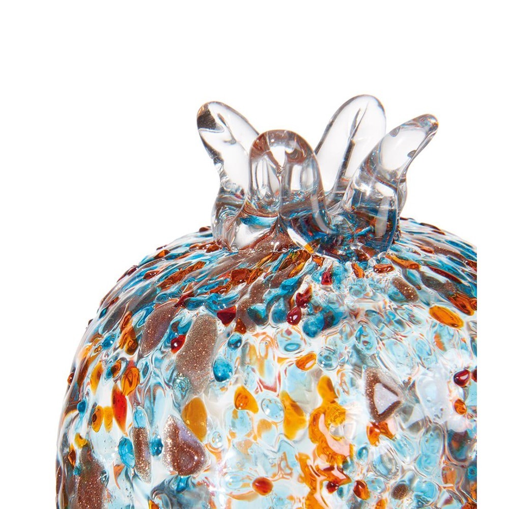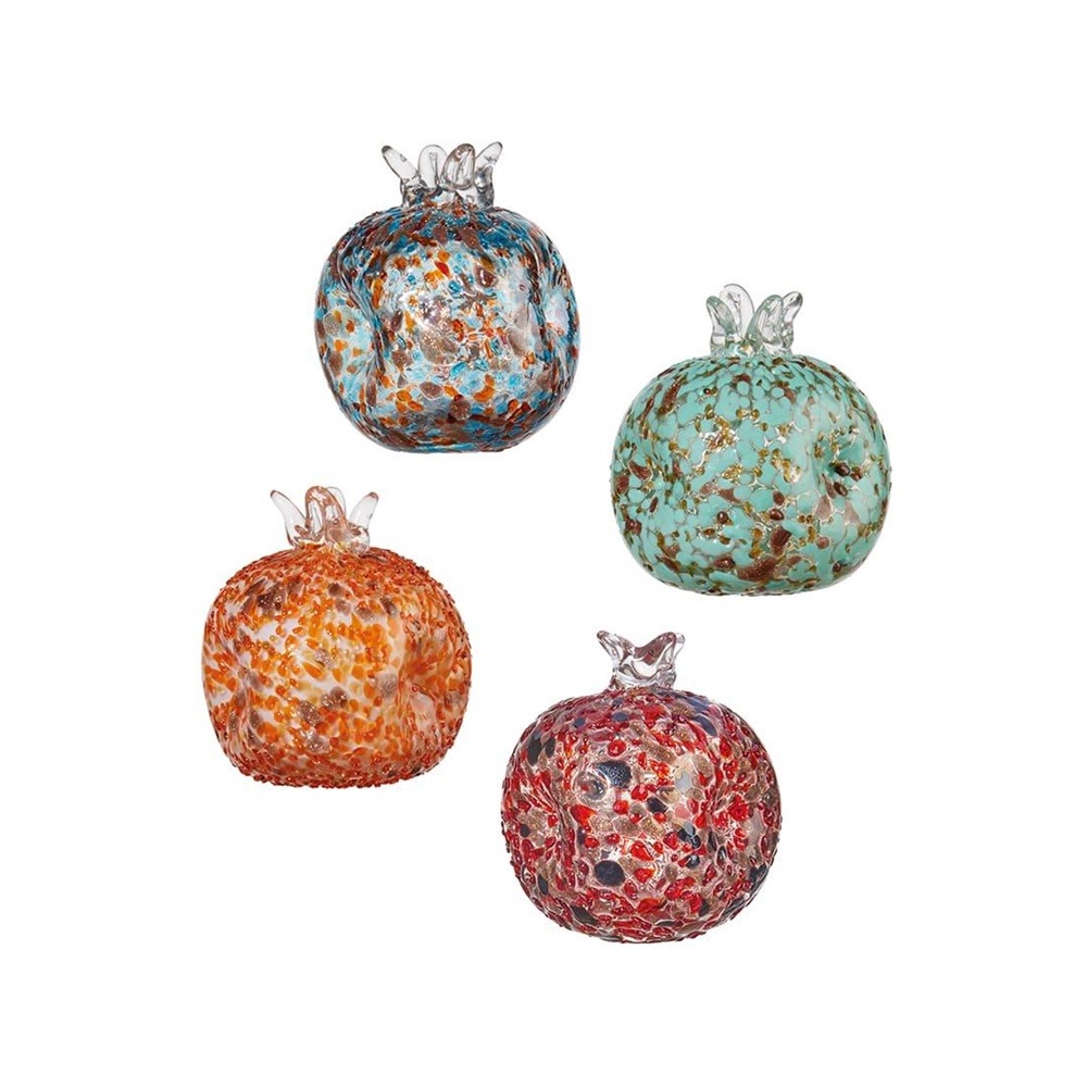 Set composto da 4 melograni decorativi in vetro. Vivace decoro di colori su base trasparente per completare l’arredamento di un ambiente moderno con elementi che che comunicano in modo fluido.