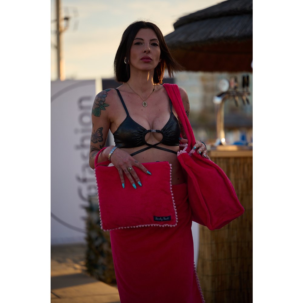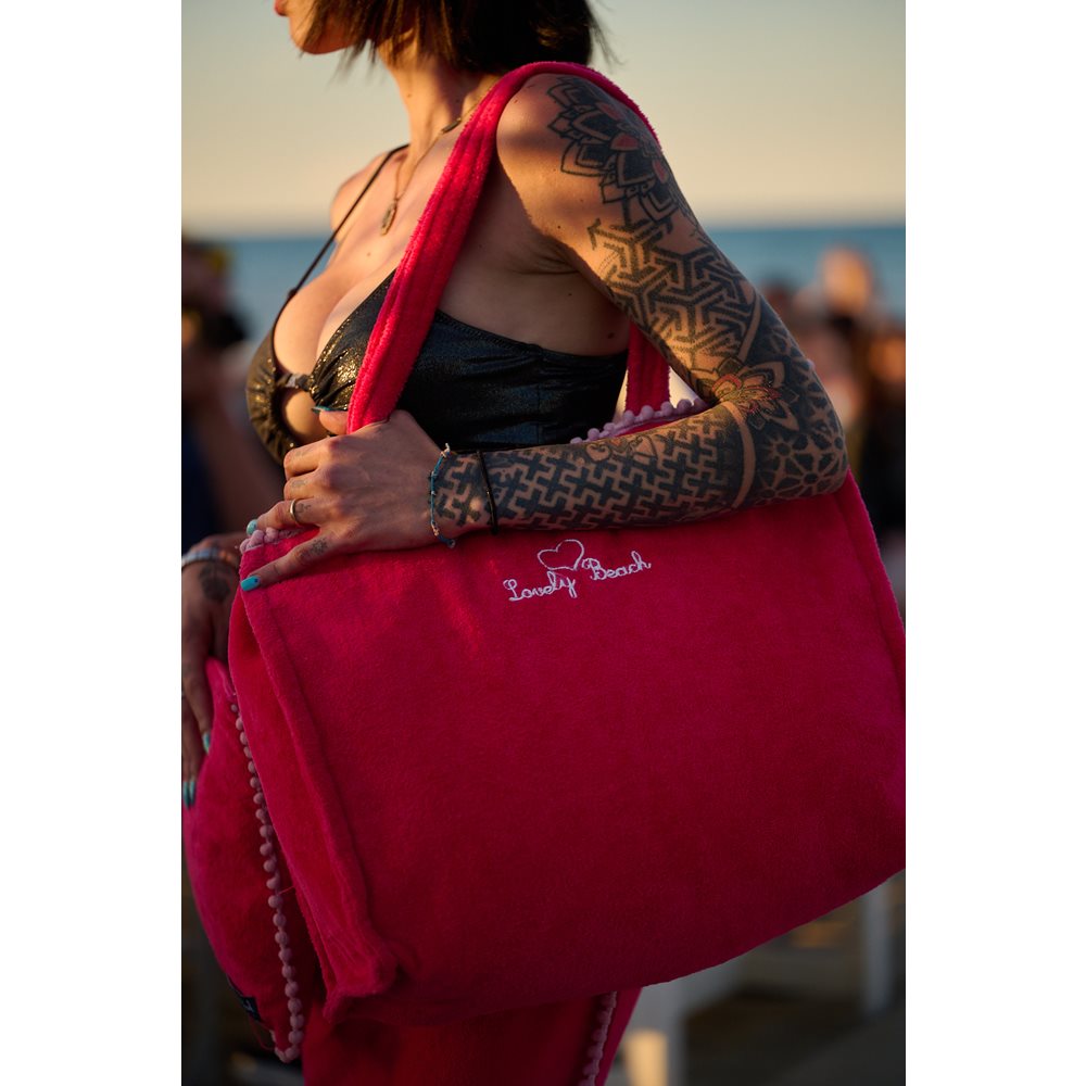 Marisol – Borsa mare velour con pompon fucsia/rosa cm 42 x 32 x 16