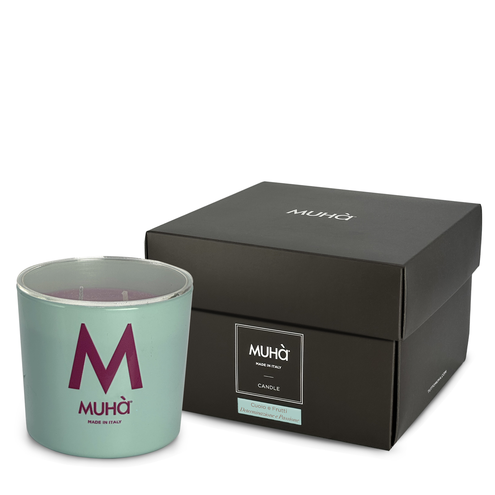 Scopri la candela profumata Muhà: un abbraccio di verde acqua, cuoio e frutti in un design elegante.