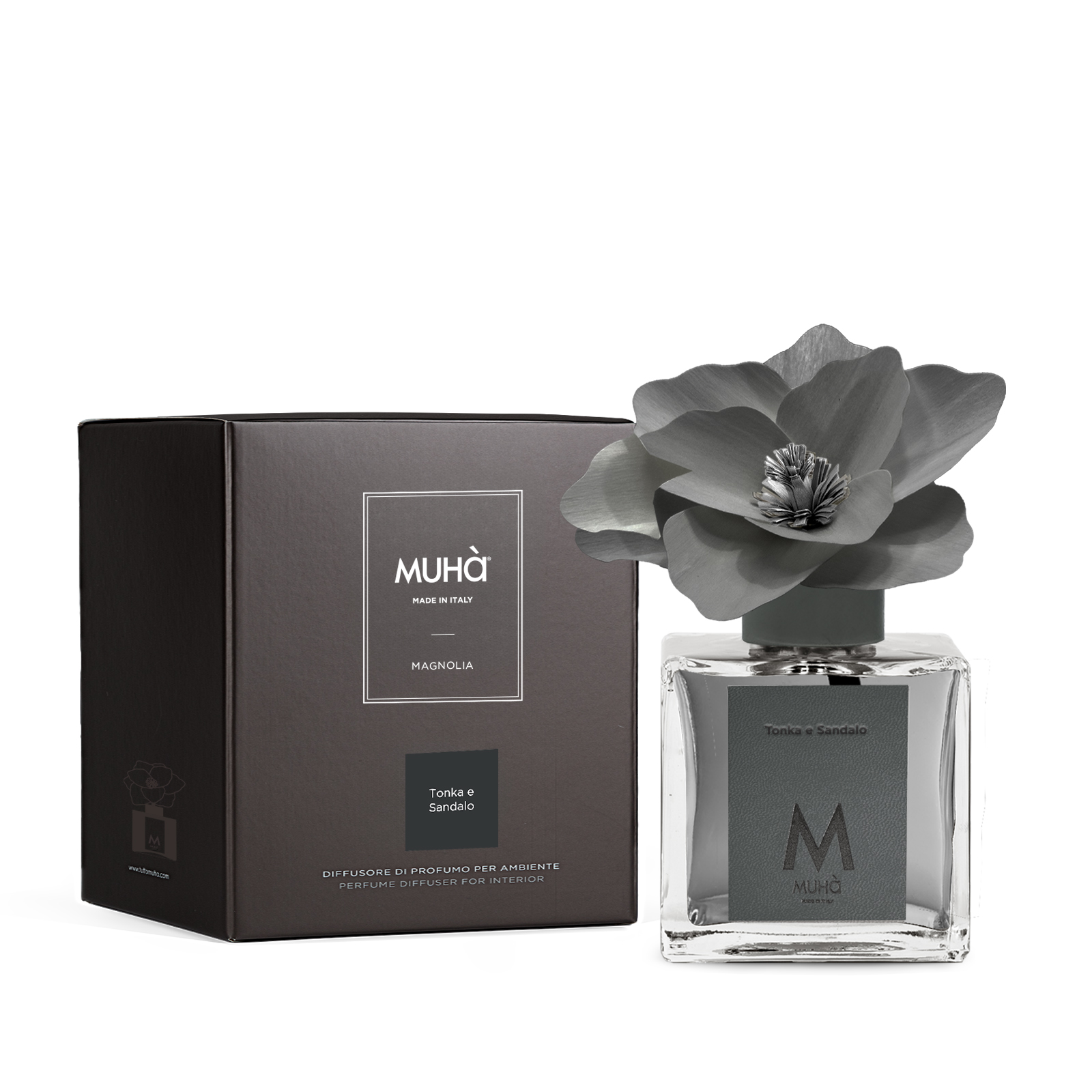 Lasciati avvolgere dalla dolcezza del Tonka e dalla calda eleganza del Sandalo con il diffusore Muhà.