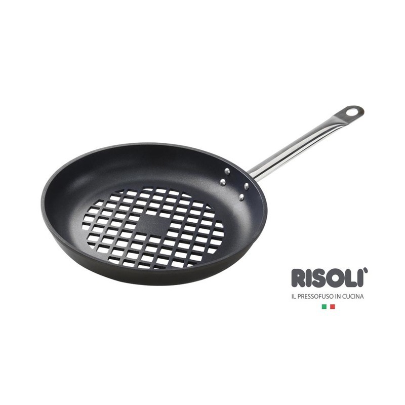 Padella BBQ con texture specifica per cottura al barbecue. Alto spessore e superficie antiaderente garantiscono una cottura ottimale sulla brace. Ideale per esempio per grigliare grandi e deliziose bistecche o braciole di maiale, in quanto conferisce incredibili striature la griglia per la rosolatura cattura e trattiene i succhi di ogni tipo di carne.