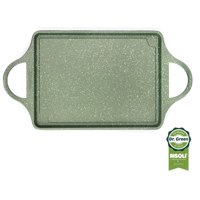 Piastra liscia multiuso 46×25 in Corpo unico in alluminio pressofuso di elevata qualità e di grande benessere . L’UNICO CON ANTIADERENTE A BASE D’ACQUA GREEN STONE INERTE E INORGANICO CON DOPPIA RESISTENZA all’usura rispetto alle padelle standard. Lo strumento ideale per cotture a fuoco basso che non destabilizzano il cibo e favoriscono lo sviluppo dei sapori. Filiera qualità integrata 100% ITALIA