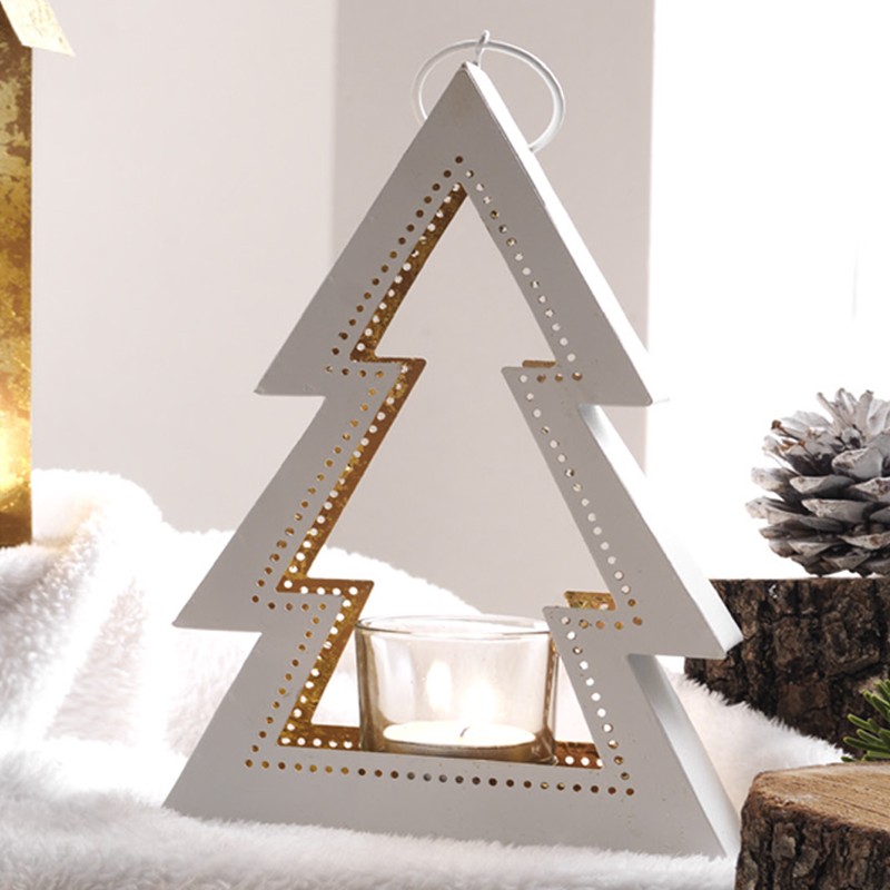 Portacandela in metallo a forma di albero, esterno colore bianco, interno rivestito in foglia oro, con bicchiere di vetro.