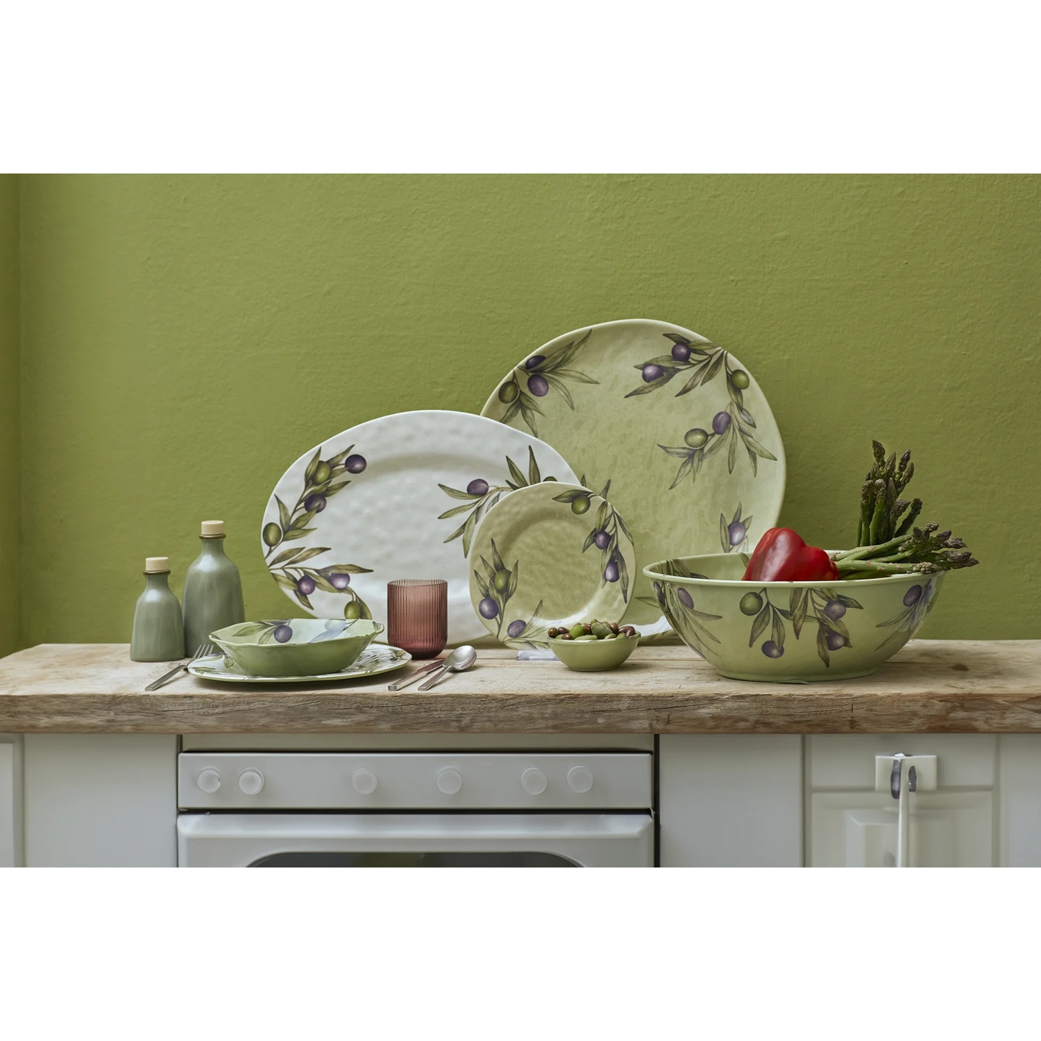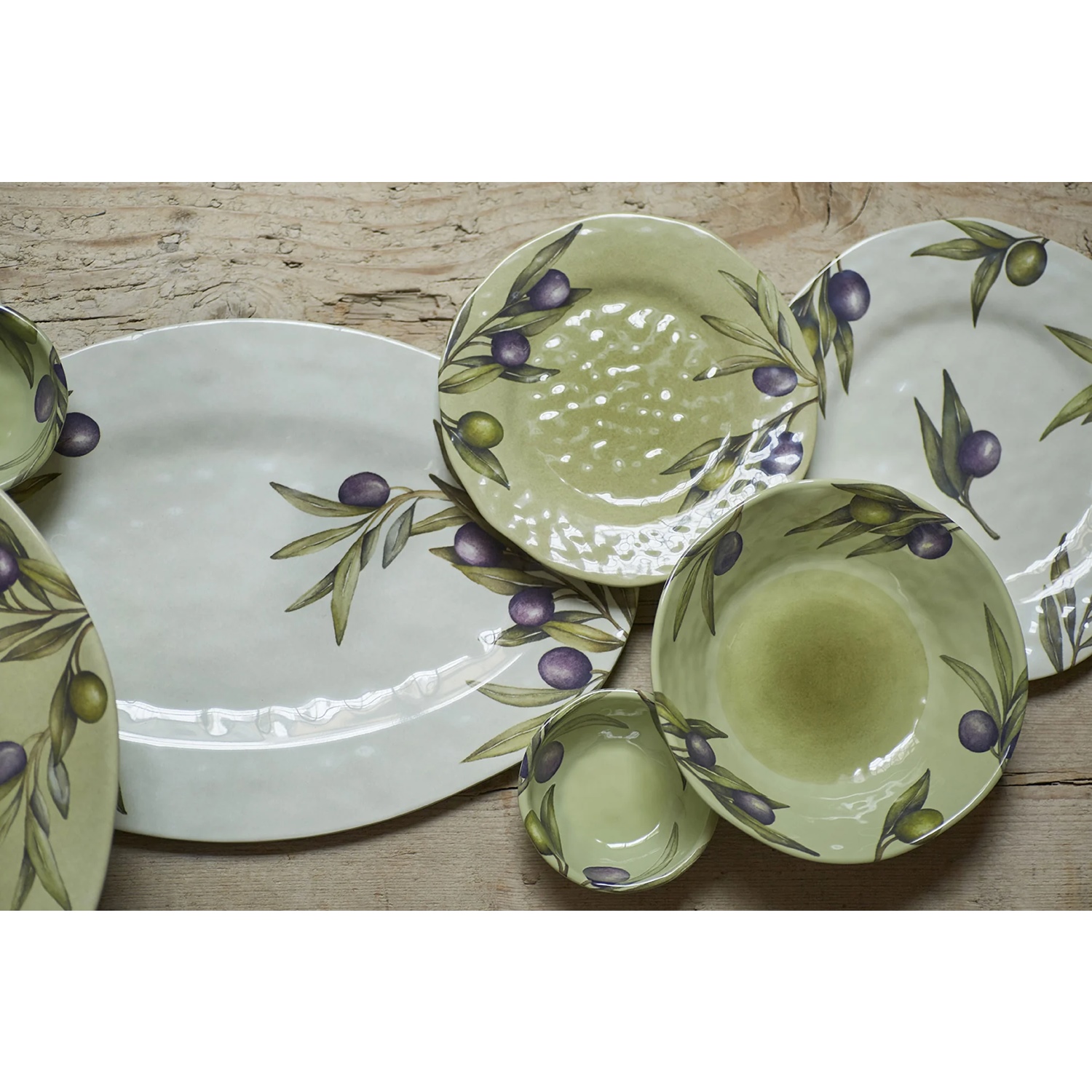 Un acquerello realizzato a mano porta in tavola tutto il sapore iconico del Mediterraneo. Foglie e frutti d’ulivo abbracciano ogni creazione in melamina, dando luogo ad un ritmo sempreverde. Per una tavola distintiva, da vivere anche in outdoor.