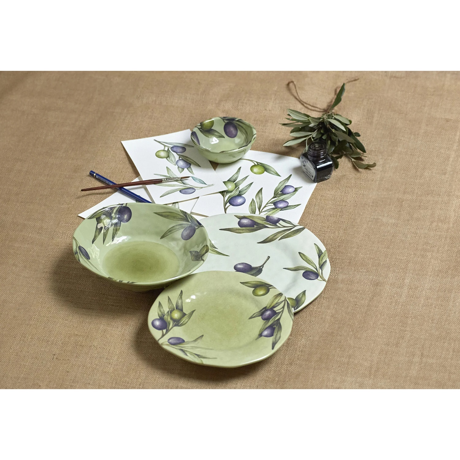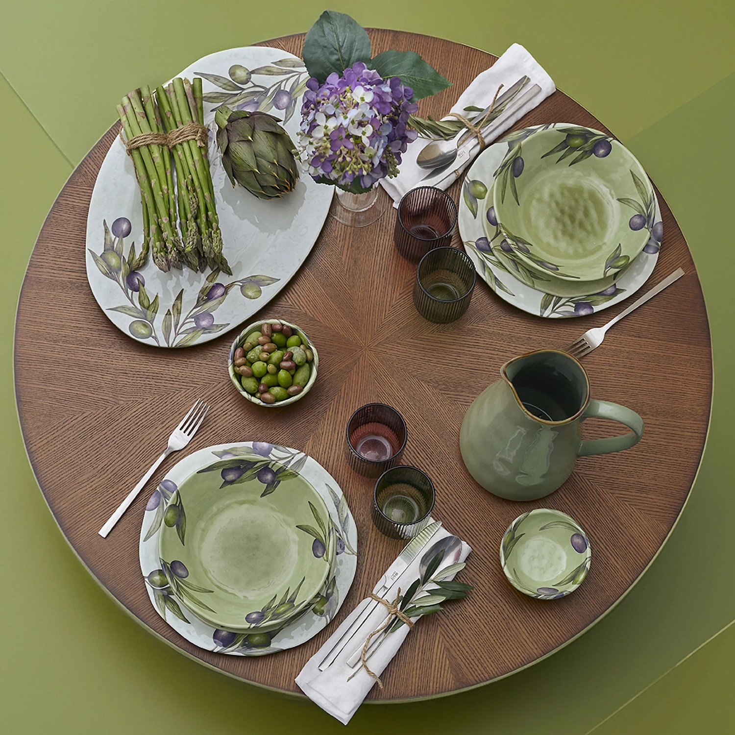 Un acquerello realizzato a mano porta in tavola tutto il sapore iconico del Mediterraneo. Foglie e frutti d’ulivo abbracciano ogni creazione in melamina, dando luogo ad un ritmo sempreverde. Per una tavola distintiva, da vivere anche in outdoor.