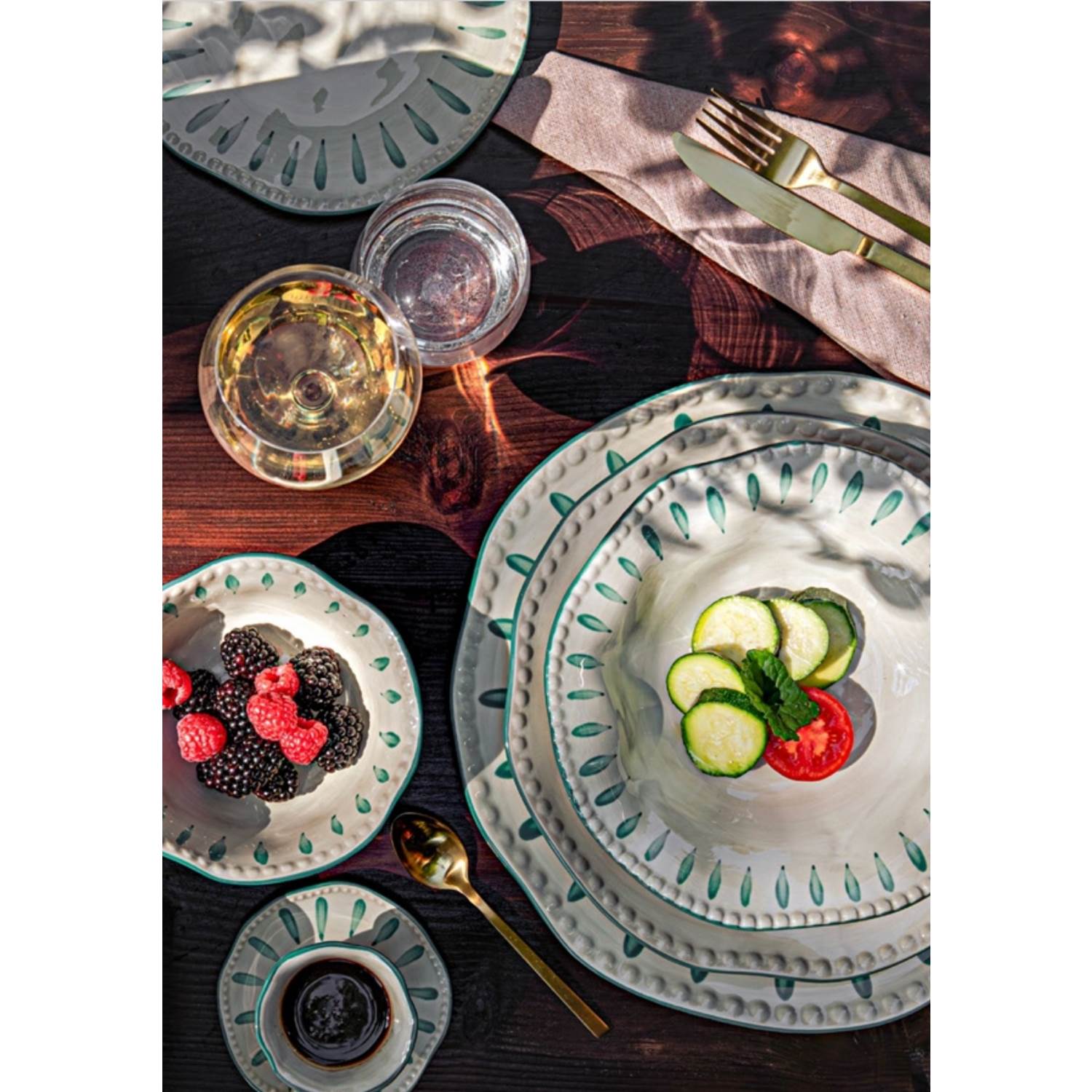 Il piatto piano Rose e Tulipani Domitilla in verde acqua è realizzato in stoneware, un materiale noto per la sua resistenza e durata. Con un diametro di 27,3 cm, è ideale per la presentazione di piatti in ambito ristorativo o per eventi. La sua finitura elegante si integra perfettamente in diverse impostazioni di tavola.