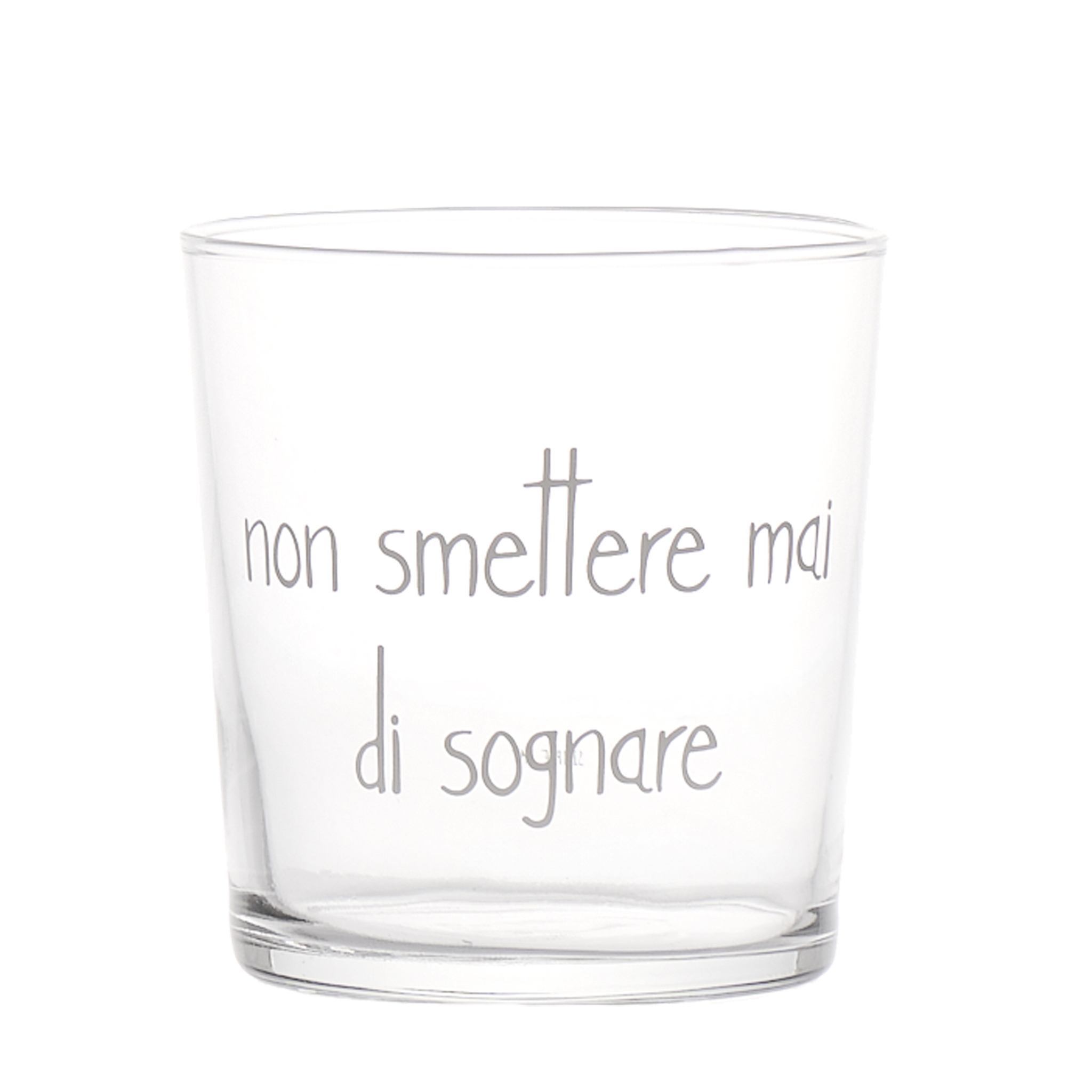 Bicchiere della linea Simple Day con capacità di 35 cl. Presenta la scritta “Non Smettere Mai di Sognare”.