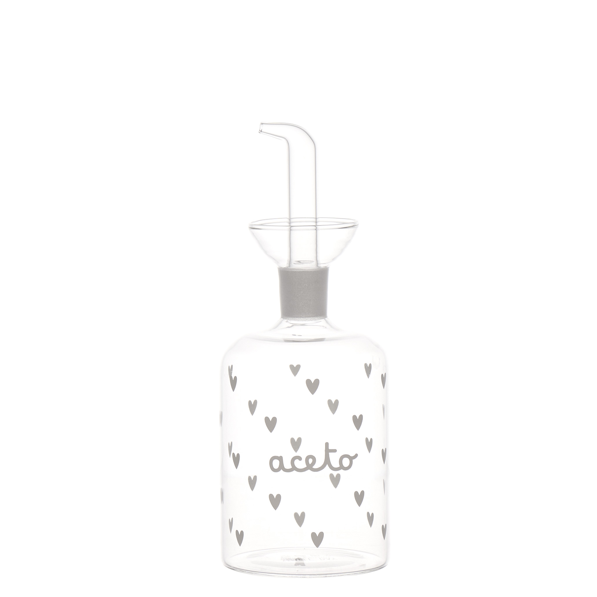 Bottiglia in vetro da 350 ml con tappo a forma di cuori, progettata per la conservazione di aceto. Prodotto della linea Simple Day, categoria Tavola.