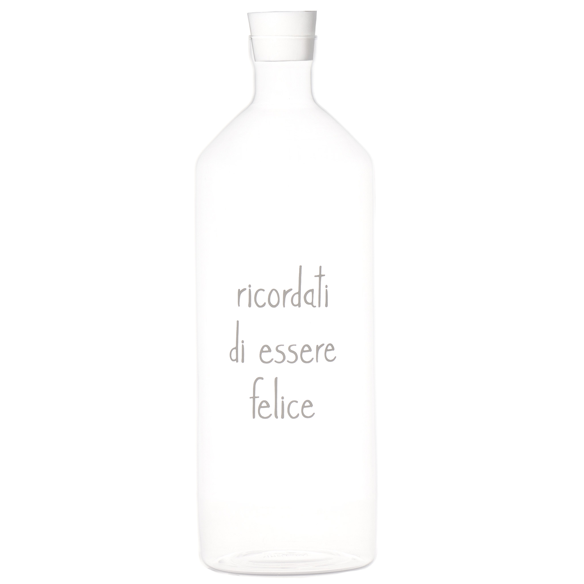 Bottiglia in vetro della linea Simple Day, caratterizzata dalla scritta “Ricordati di Essere Felice”. Prodotto progettato per l’uso quotidiano.