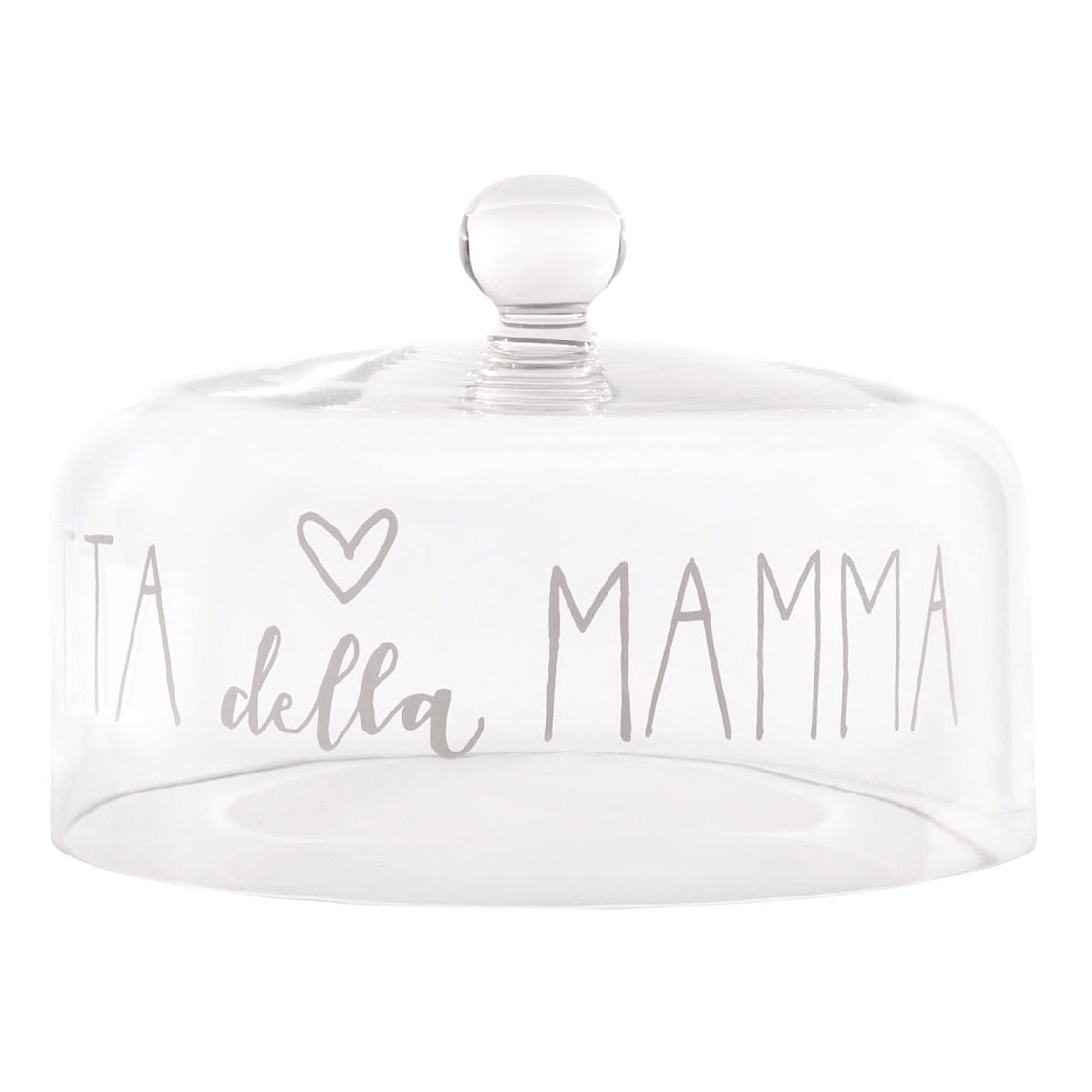 Campana in vetro con base in ceramica bianca, dal design semplice e funzionale. Dimensioni di 28,5 cm, adatta per la presentazione di alimenti.