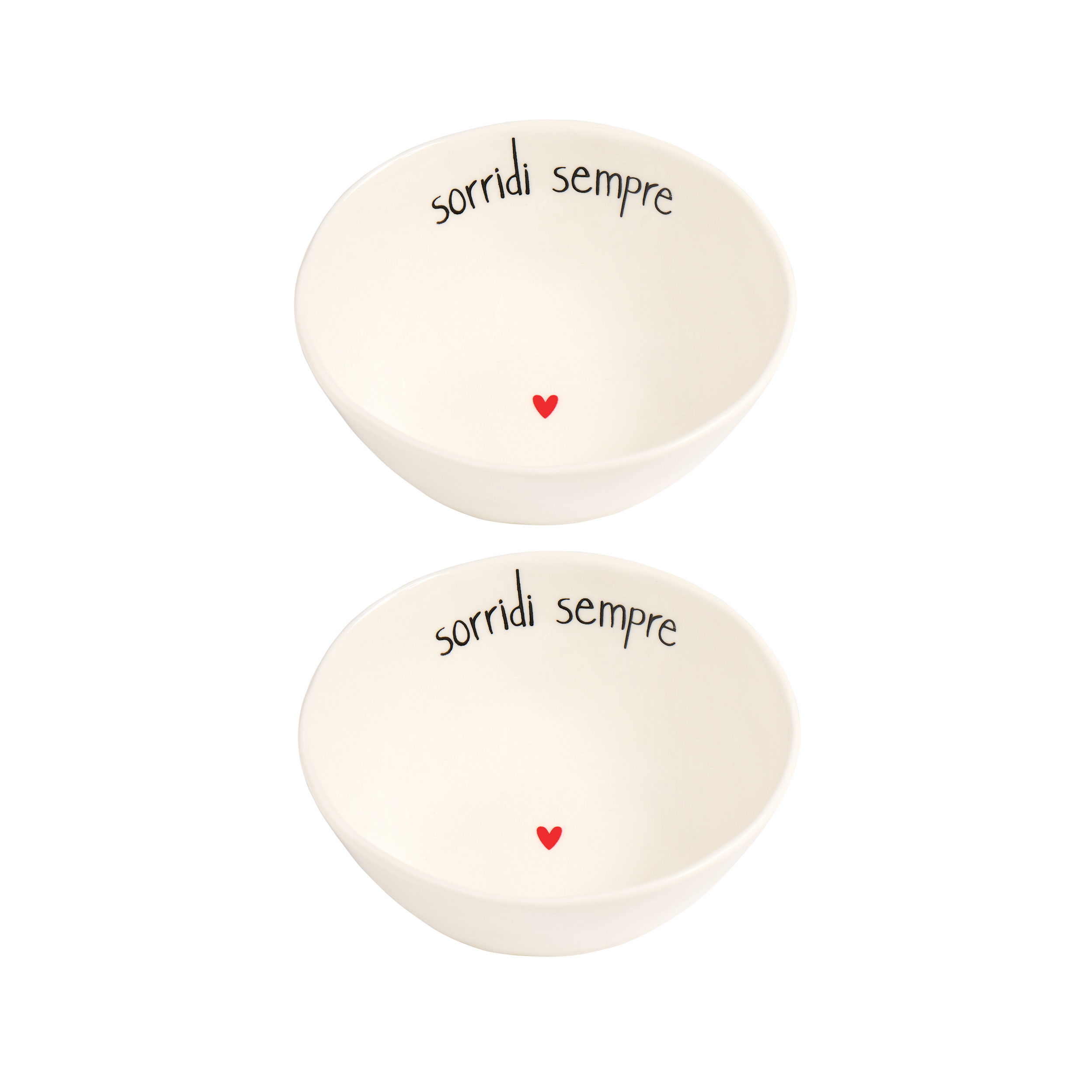 Set di 2 coppette della linea Simple Day, con dimensioni di 12.6 cm di diametro e 5 cm di altezza. Design funzionale con il messaggio “Sorridi Sempre”.