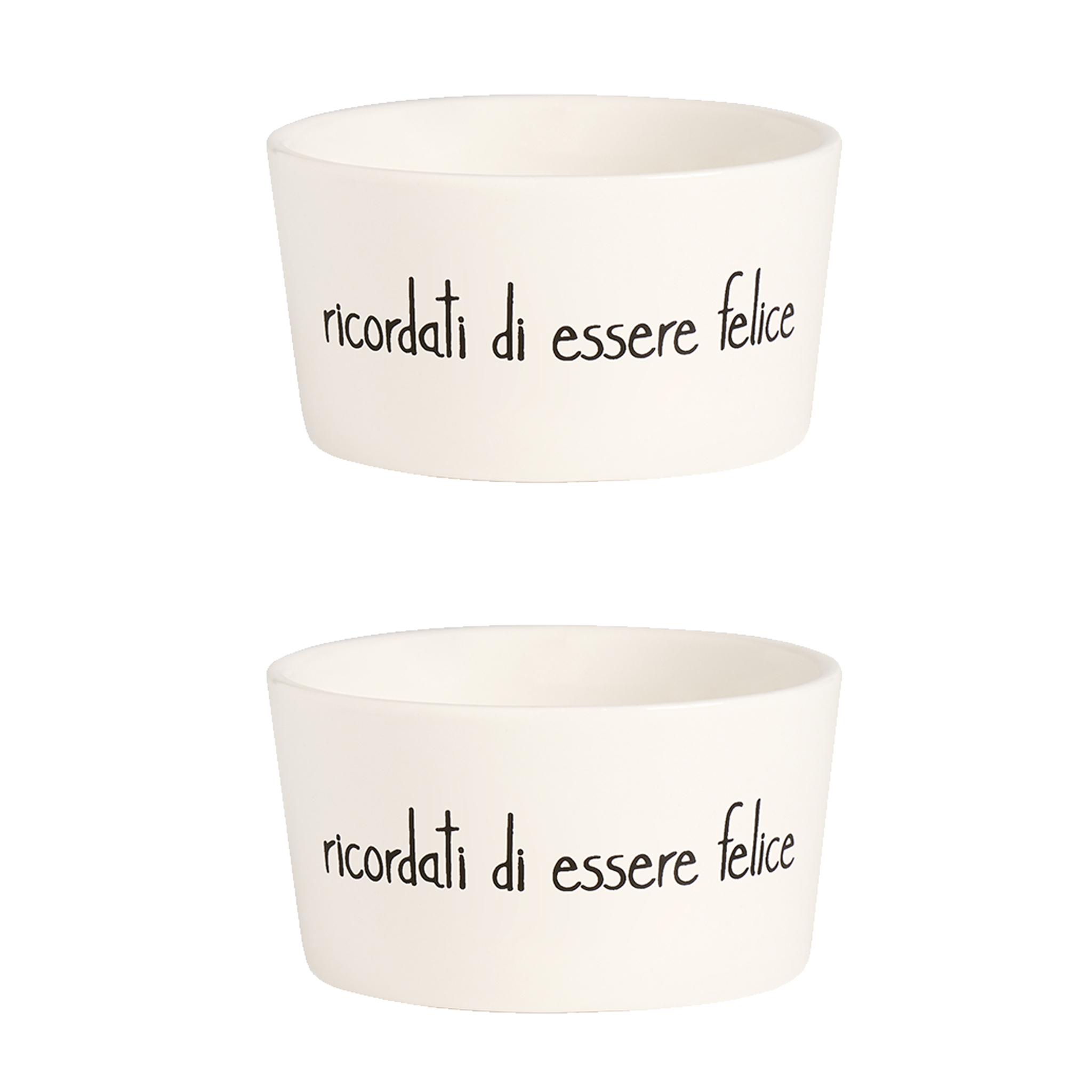 Set di 2 coppette della linea Simple Day, caratterizzate da un design sobrio e funzionale. Ogni coppetta riporta la scritta “Ricordati di Essere Felice”.