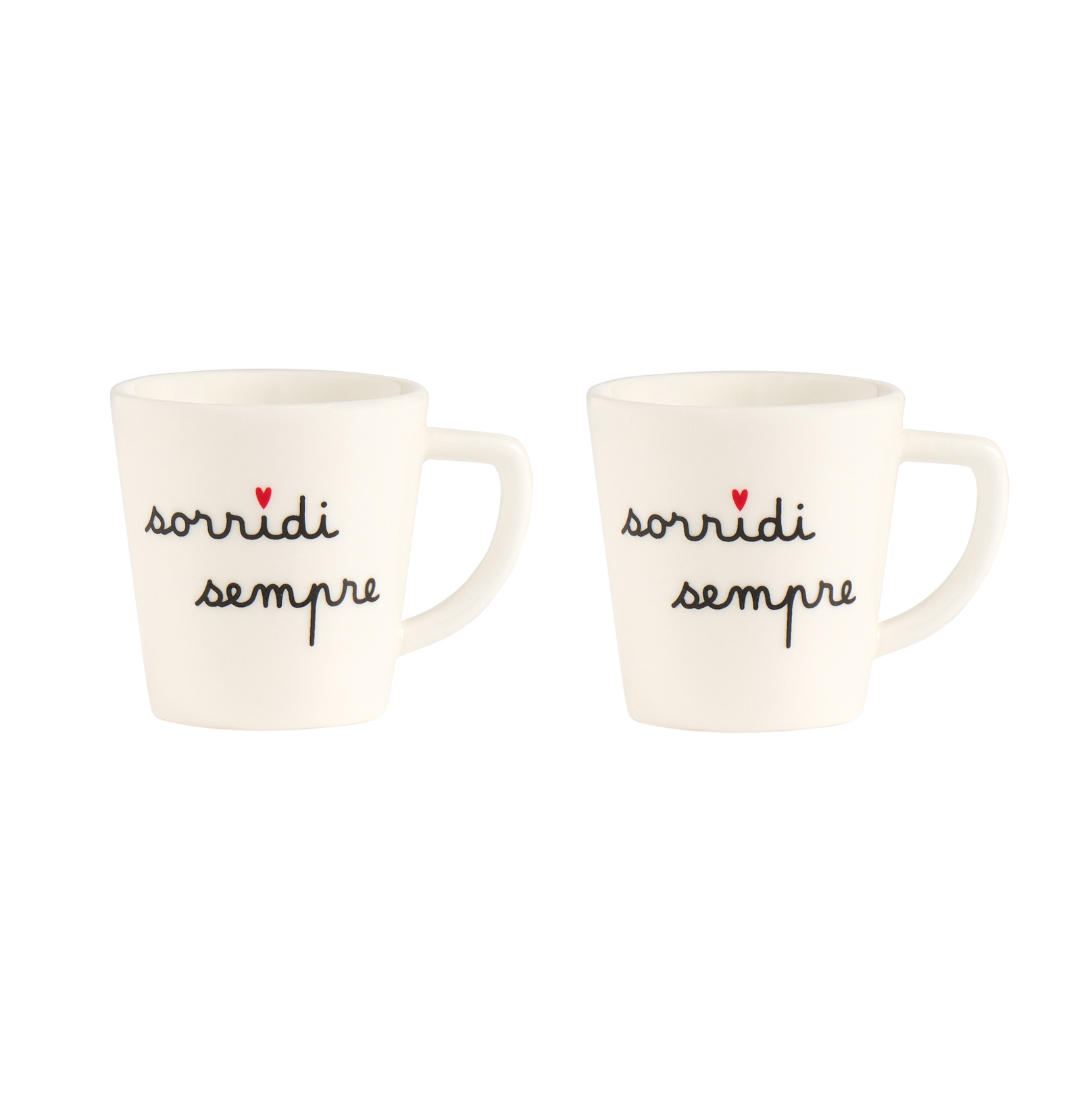 Set di 2 tazzine da espresso della linea Simple Day, caratterizzate da un design semplice e funzionale. Le tazzine presentano la scritta “Sorridi Sempre”.
