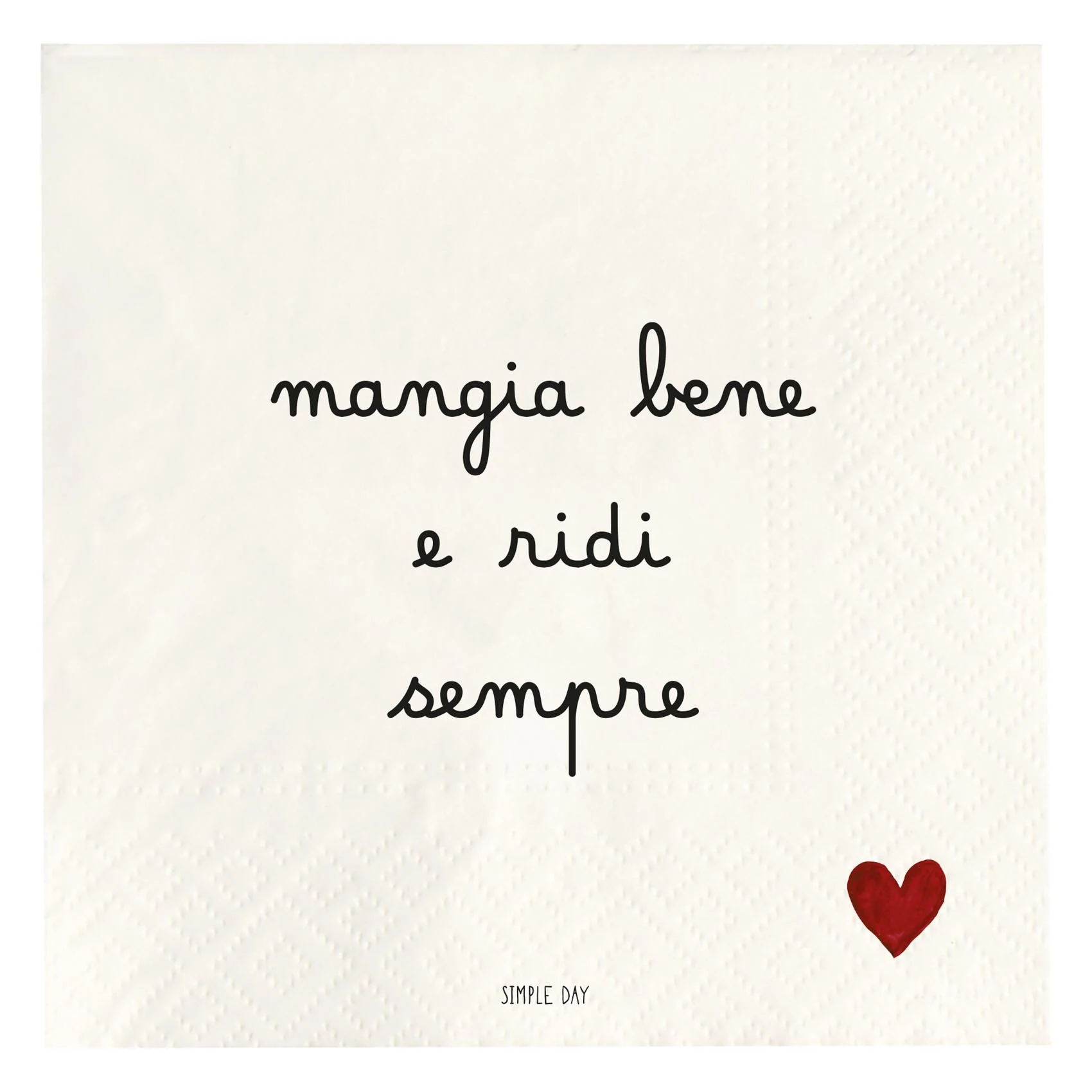 Set di 20 tovaglioli in carta, dimensione 33×33 cm, con design “Mangia Bene e Ridi Sempre”. Prodotto della linea Simple Day, categoria Tavola.