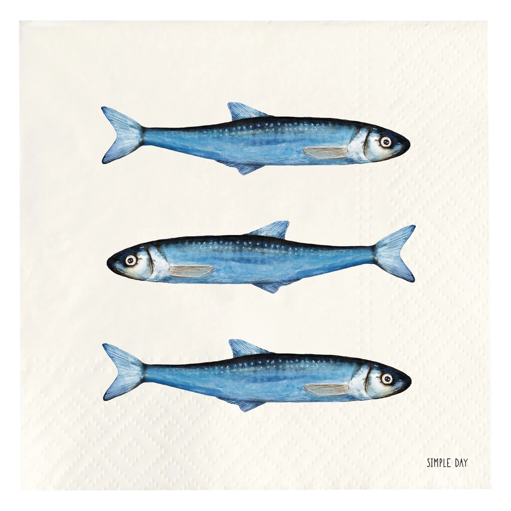 Set di 20 tovaglioli in carta con dimensioni di 33×33 cm, decorati con un motivo di sardine. Prodotto della linea Simple Day, progettato per l’uso nella tavola.
