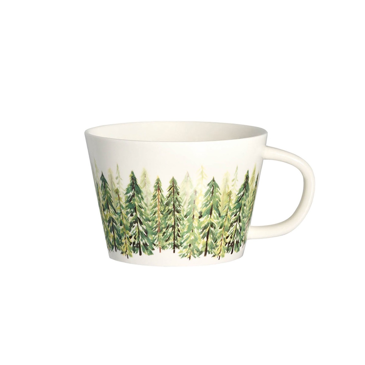 Tazza da colazione della linea Simple Day, decorata con un motivo di abeti. Prodotto adatto per l’uso durante il periodo natalizio e per occasioni festive.