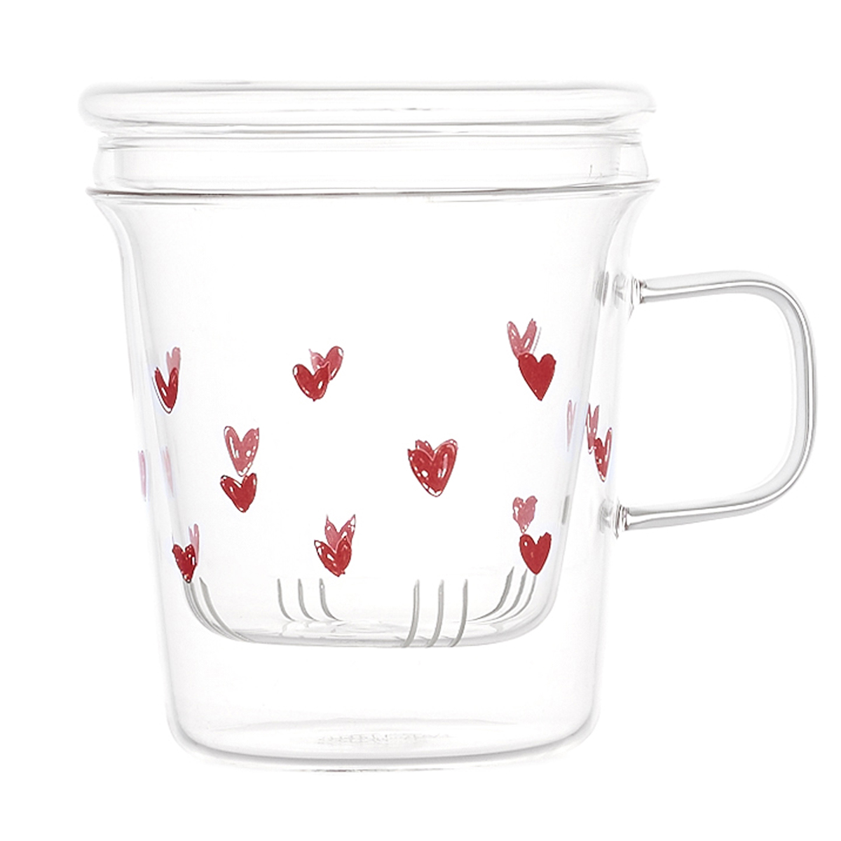 Tisaniera della linea Simple Day con motivo a cuori rossi, progettata per un uso quotidiano. Realizzata per garantire funzionalità e praticità nella preparazione delle tisane.