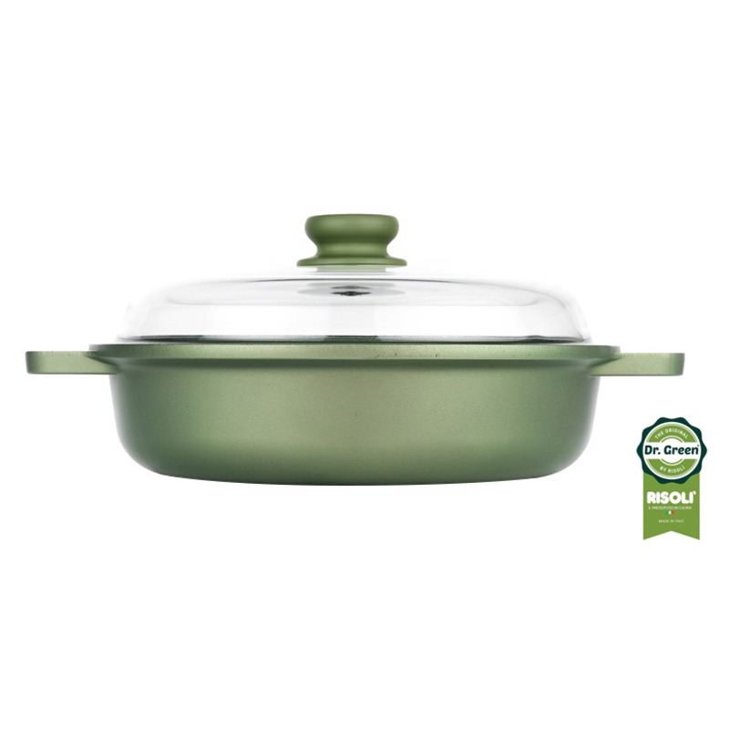 Tutti i prodotti della linea Dr. Green® sono realizzati con l’innovativo antiaderente a base d’acqua Greenstone®, inerte e inorganico, con doppia resistenza all’usura.Grazie al corpo in Alluminio pressofuso ad alto spessore (6mm) la temperatura di cottura si diffonde in maniera omogenea lungo tutta la superficie, ciò consente una cottura ottimale già a fuoco basso che non destabilizza il cibo e ne favorisce lo sviluppo dei sapori.