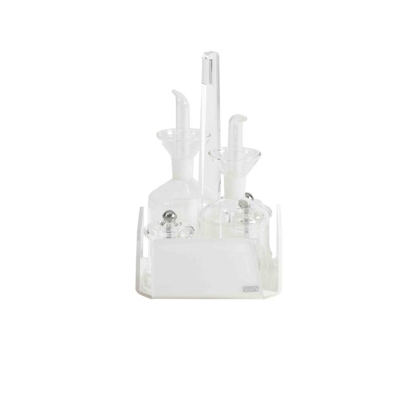 Vesta Home – Menage Set olio aceto sale pepe linea Like Water in plexiglass bianco satinato/bianco con bottiglie in vetro e salvagoccia dim. 14,5x14x5x23 cm