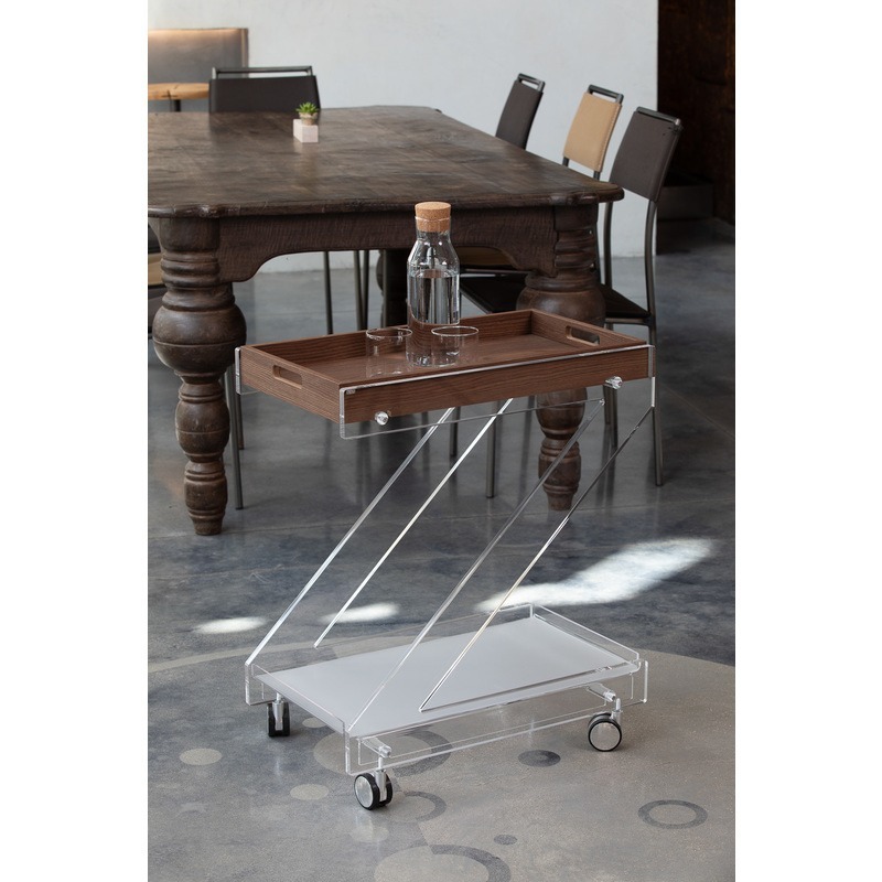 Vesta Home – ZETA Carrello a due ripiani in cristallo acrilico trasparente con vassoio superiore in legno scuro e ruote, dim. 62 x 38 x 78h cm.
