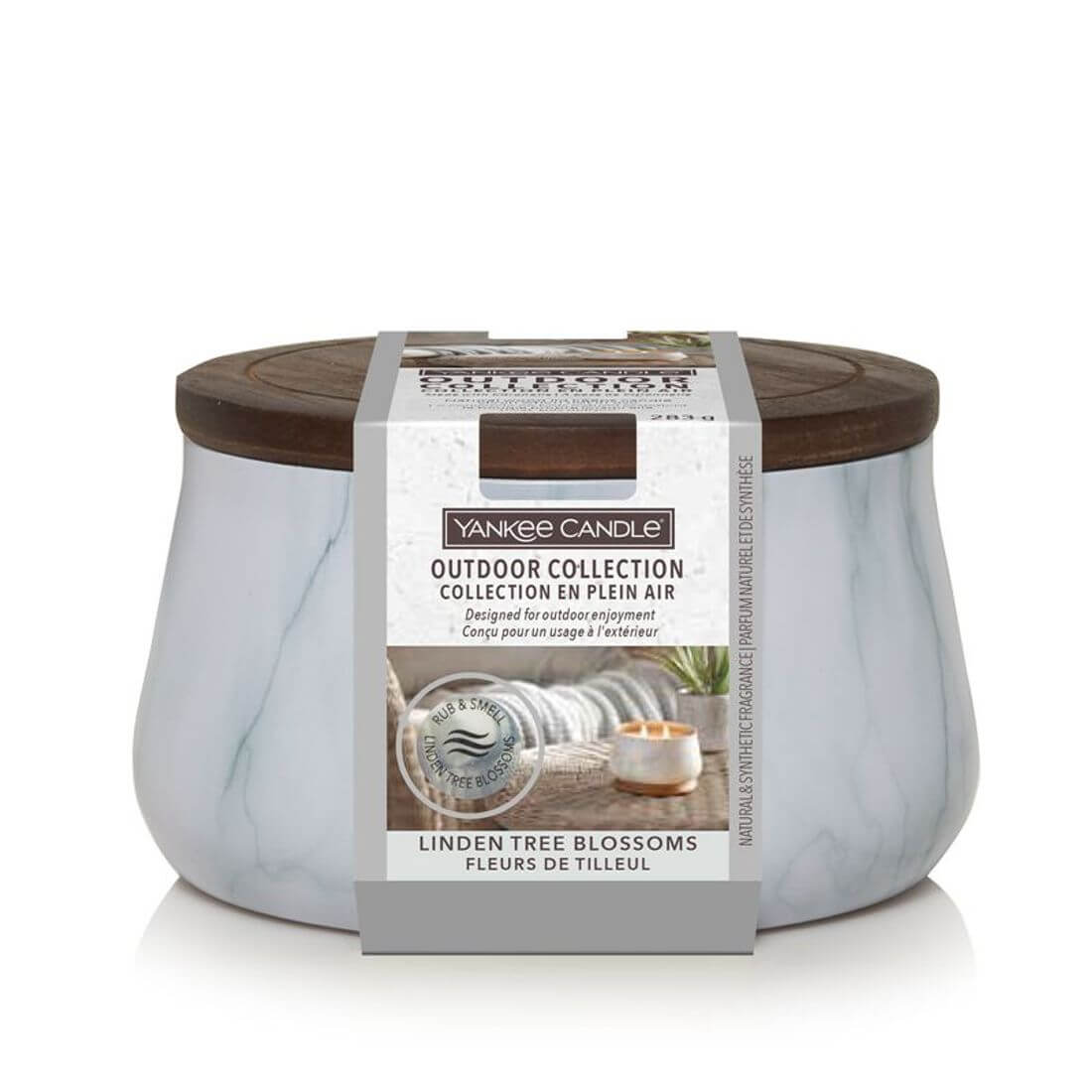 YANKEE CANDLE – Candela da esterno Linden Tree Blossom con contenitore in latta, stoppino da esterno e coperchio in legno naturale – Una proposta unica e curata nei dettagli, pensata per sorprendere e valorizzare ogni occasione speciale con stile ed emozione.
